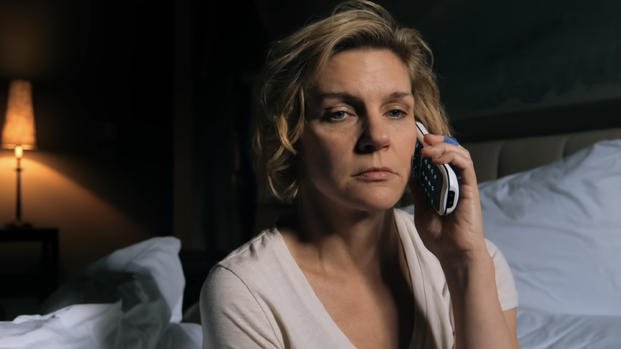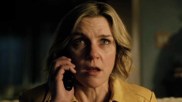 Rhea Seehorn, looking tired and unhappy, dressed in a white t-shirt, on the phone, in Apple TV+'s Pluribus. Screenshot from official trailer.