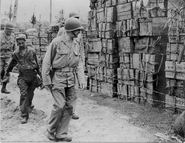 Lt. Gen. Robert C. Richardson, commander of Army forces in the Pacific, inspects captured supplies on Saipan. Richardson landed on the island without permission from Holland Smith or naval commanders to review Army troops and present decorations—then confronted the Marine general, declaring "You Marines are nothing but a bunch of beach runners anyway. What do you know about land warfare?" (Wikimedia Commons)