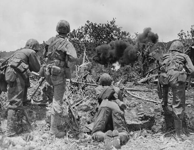 U.S. Marines clear Japanese defenses on Saipan in June 1944. The 2nd and 4th Marine Divisions advanced up the island's flanks across relatively open terrain but were forced to halt when the 27th Infantry Division's slower progress through the jungle-choked center left their flanks dangerously exposed—a delay that enraged Marine Lt. Gen. Holland M. Smith. (Wikimedia Commons)