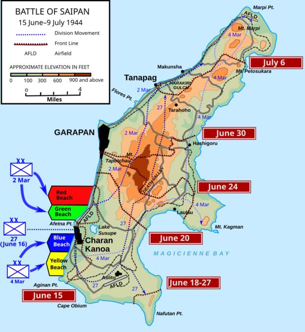 Map of operations on Saipan during World War II. The 27th Infantry Division landed in the center of V Amphibious Corps and advanced through thick jungle valleys while the 2nd and 4th Marine Divisions moved up the flanks across relatively open ground. The Army's assignment to attack Mount Tapotchau through Death Valley and Purple Heart Ridge proved far more difficult than the Marine general understood. (Wikimedia Commons)