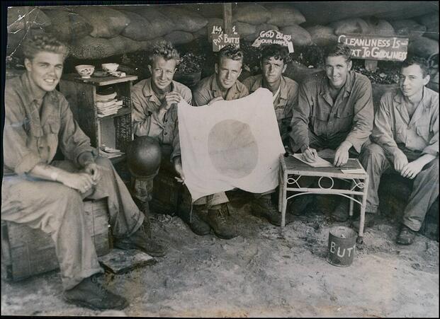Army soldiers from the 27th Infantry Division display a captured Japanese flag in their bunker on Saipan. Despite facing formidable Japanese defenses and difficult jungle terrain, the division's methodical advance was criticized by Marine Lt. Gen. Holland M. Smith, who expected faster progress and ultimately fired their commander on June 24, 1944. (Wikimedia Commons)