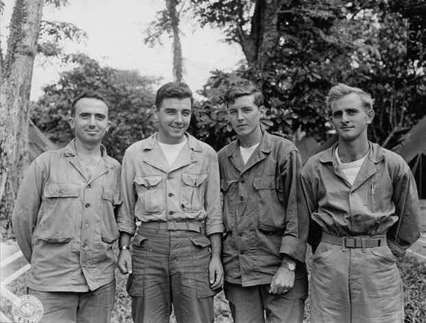 Four soldiers of the 27th Infantry Division who each earned the Bronze Star for heroic actions against Japanese troops during the Battle of Saipan. Despite facing horrendous casualties and overcoming formidable odds in Death Valley, Time magazine correspondent Robert Sherrod wrote that the soldiers "froze in their foxholes"—a humiliating article that devastated the division's morale and was based entirely on Marine Corps accounts without ever visiting the 27th. (Wikimedia Commons)