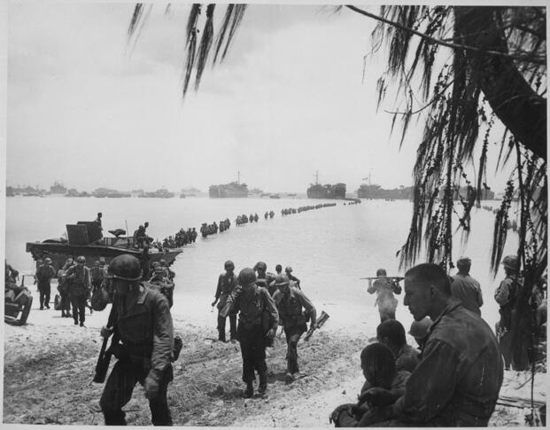 Army soldiers of the 27th Infantry Division wade ashore on Saipan in June 1944. The division landed by night through waters crowded with Navy vessels in a chaotic operation where Holland Smith's V Amphibious Corps staff failed to notify the Navy of the Army's arrival, forcing soldiers to plead with confused naval officers to get ashore. (Wikimedia Commons)