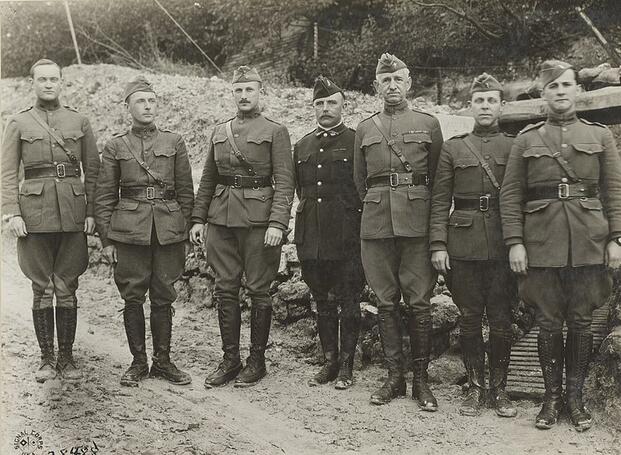 Brig. Gen. William Nicholson (third from right) and his brigade staff during the Meuse-Argonne Offensive. Nicholson was the oldest American soldier to see frontline combat during WWI. His decision to press his men forward until the armistice led to the death of Henry Gunther. (Wikimedia Commons)