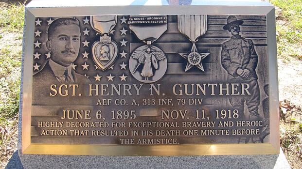 Nearly nine decades after his death, on Nov. 11, 2008, the French government dedicated a memorial near the spot where Gunther fell in Chaumont-devant-Damvillers. Two years later, the German Society of Maryland unveiled a memorial plaque at his Baltimore grave. The ceremony was scheduled for 10:59 a.m.