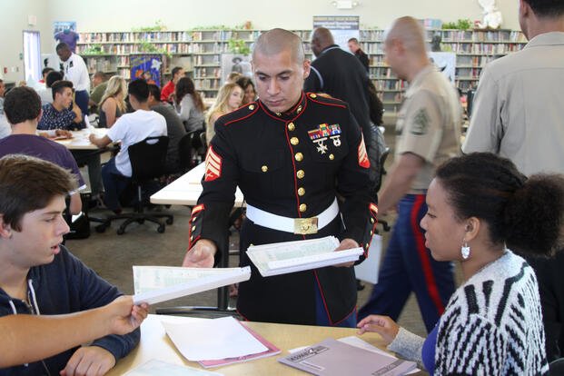 Sergeant Eddie Quezada, a Marine Corps recruiter from Marine Corps Recruiting Station San Diego, gathers answer key sheets during Mission Bay High School’s first Armed Services Vocational Aptitude Battery in San Diego, 23 Oct 2014 (U.S. Marine Corps photo by Sergeant Erica Kirsop)