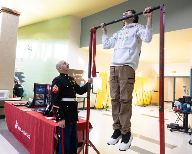 U.S. Marine Corps Sergeant Michael Henley, a Debary, Florida native and canvassing recruiter with Recruiting Station Richmond, 4th Marine Corps District, supervises as students conduct a pull-up challenge during a high school visit at Warhill High School in Williamsburg, Virginia, Dec. 3, 2024 (U.S. Marine Corps photo by Corporal Trion Jenkins)