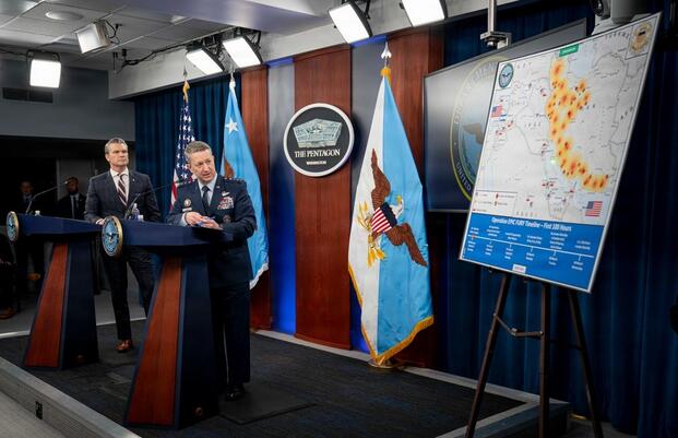 Secretary of War Pete Hegseth and Chairman of the Joint Chiefs of Staff Gen. Dan Caine conduct a press briefing on Operation Epic Fury at the Pentagon, Arlington, Virginia, March 4, 2026. At the direction of the President of the United States U.S. Central Command (CENTCOM) commenced Operation Epic Fury Feb. 28. (DoW photo by Benjamin Applebaum)