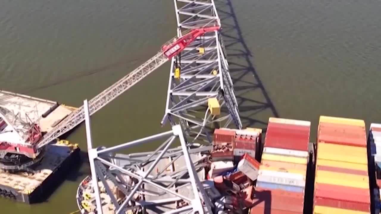 Salvage crews on Sunday began removing containers from the deck of the cargo ship that crashed into and collapsed the