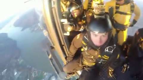 Members of the West Point Parachute Team jump onto the Plain at West Point.