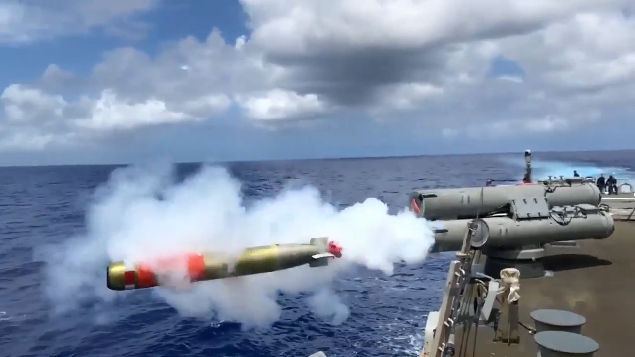 The destroyer USS Curtis Wilbur launches a recoverable exercise torpedo and fires her forward 5" MK45 gun.