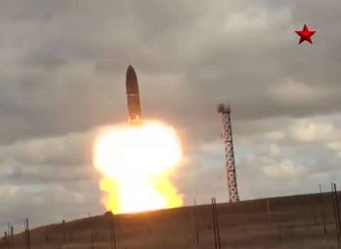 Russian military firing an intercontinental missile RS36 SATAN. The R-36 is a family of intercontinental ballistic missiles (ICBMs) and space