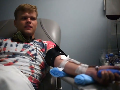 Hospitalman Nicholas Cool, a recovered COVID-19 patient, is the first convalescent donor to donate plasma at the Armed Services Blood