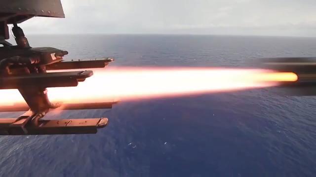 A U.S. Navy MH-60S Sea Hawk helicopter launches an AGM-114N Hellfire missile at the decommissioned USS Rentz (FFG-46) during a