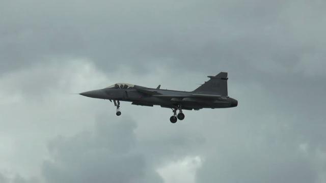 The JAS 39 Gripen, a light single-engine multirole fighter manufactured by Saab, gets a workout at the Farnborough Air Show.