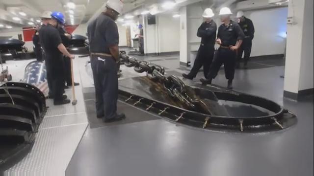 U.S. Navy aircraft carrier USS Ronald Reagan (CVN 76) conducts an anchoring evolution in the forecastle of the ship.