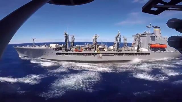 Amphibious assault ship USS Boxer (LHD-4) takes on food and supplies during a replenishment-at-sea (RAS) with fleet replenishment oiler USNS