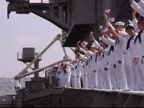 USS Ronald Reagan Sailors holding up flag while manning the rails in dress whites
