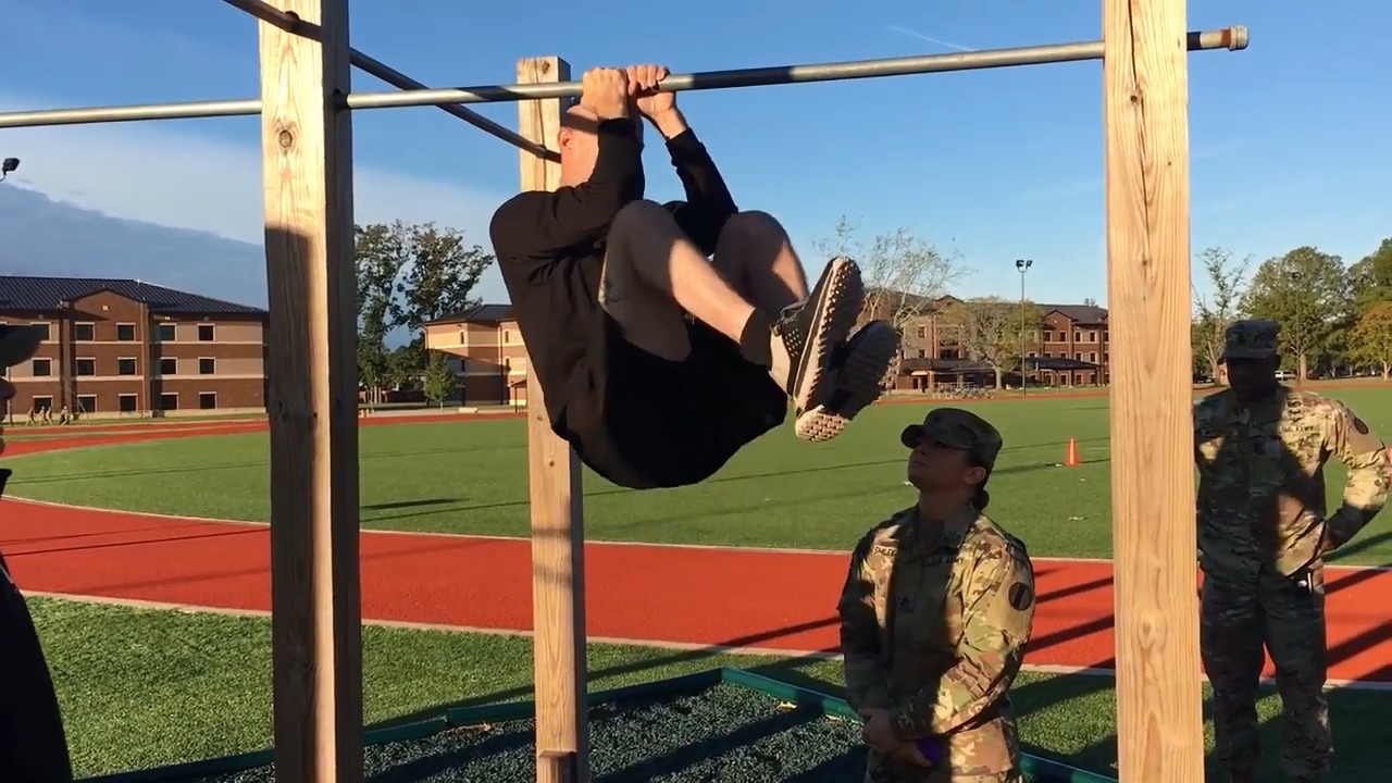 Whitfield East, research physiologist for Center for Initial Military Training, explains the leg tuck exercise for the Army fitness test.