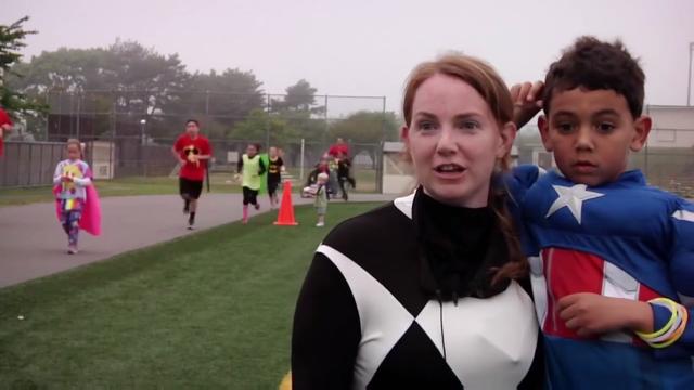 Superheroes from around the base run laps in support of military children.