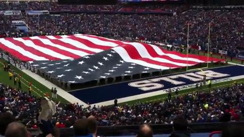 Some pregame festivities went awry when the 100-yard American flag ripped at Ralph Wilson Stadium. The giant flag was spread