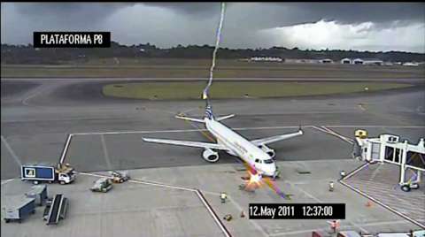 Lightning strikes a Copa Airlines (a Continental affiliate) airplane at the gate on May 12, 2011. You'll need to watch