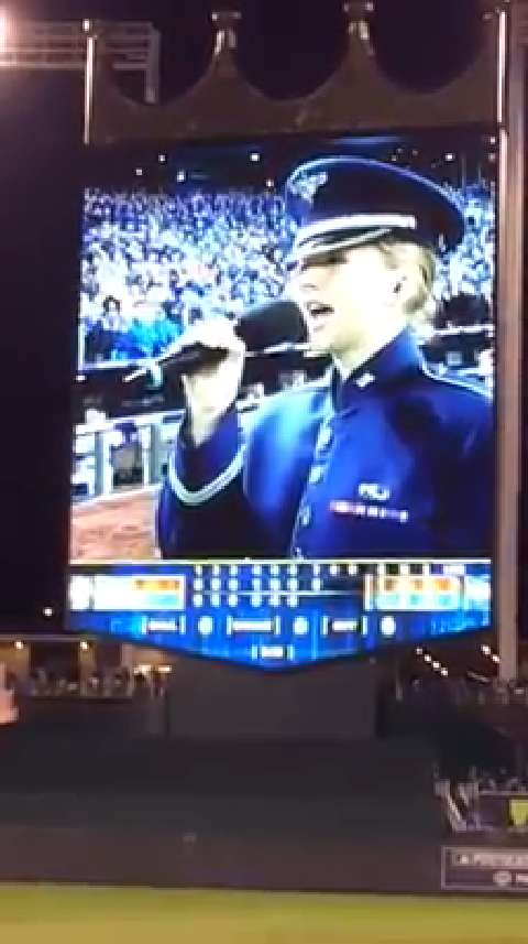 Airman First Class Michelle Doolittle performs "God Bless America" during the seventh inning stretch of game two of the 2015