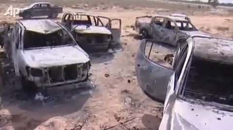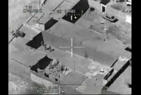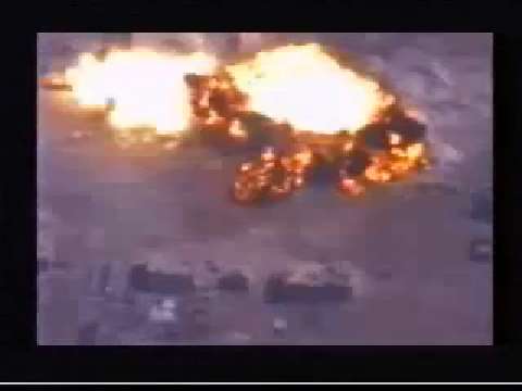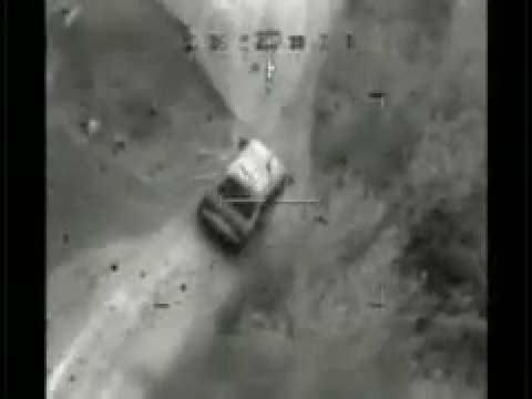 B-roll of aerial gun tape vehicle engagement. Scenes include Apache helicopter identifying and engaging vehicles with hellfire missiles and 30mm