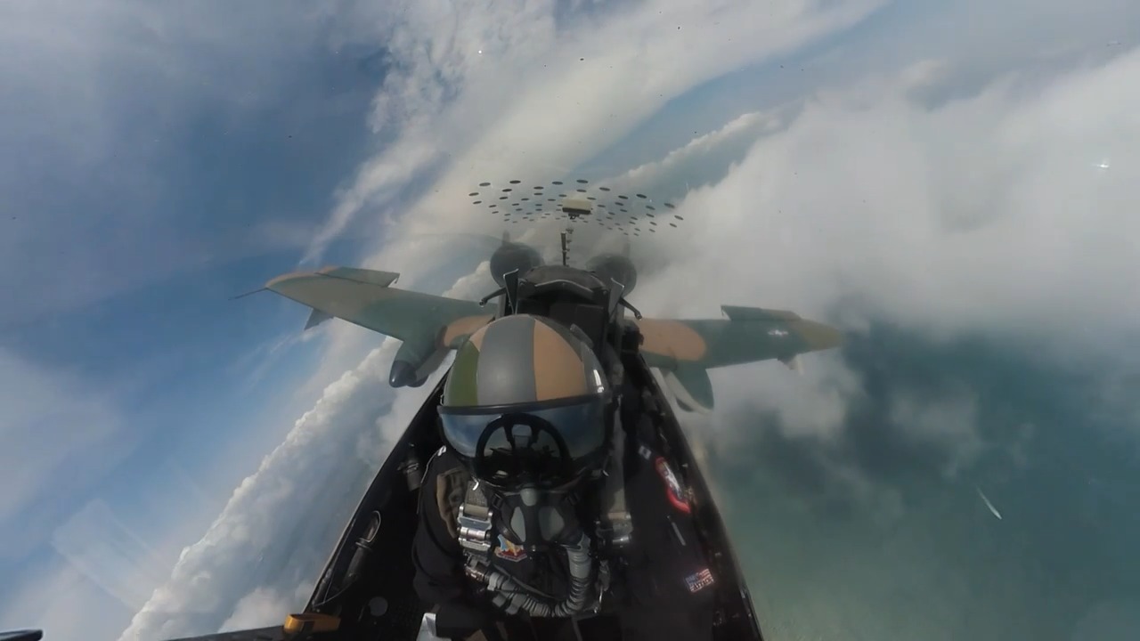 Aerial footage from inside the cockpit of the A-10 Thunderbolt II Demonstration Team jet flying over Cocoa Beach during the