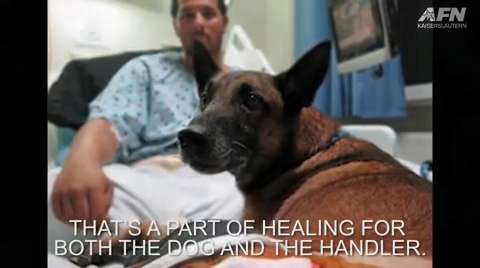Military Working Dog Rocky sustained multiple wounds in combat with his handler, Specialist Andrew Brown, in Afghanistan. He is recuperating