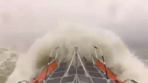 A Coast Guard crew aboard Station Chatham's 42-foot Special Purpose Craft - Near Shore Lifeboat crashes through the surf of