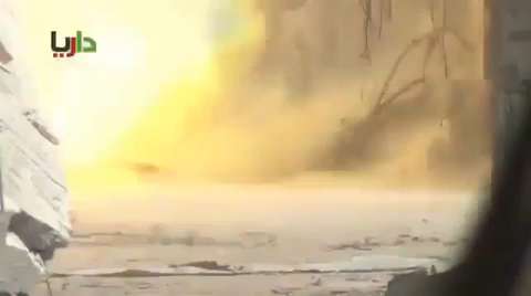 FSA camera position gets blasted by an SAA tank in Darayya. 04/09/2013.