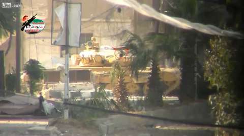 A Syrian Army tank works together with a spotter to engage an FSA sniper in Daraya. According to the source