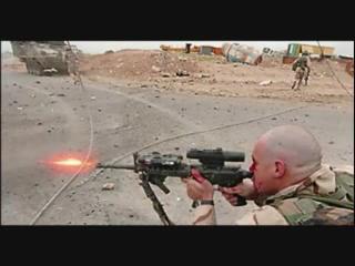 Soldiers take cover on a rooftop and exchange fire with insurgents. April 25, 2007.