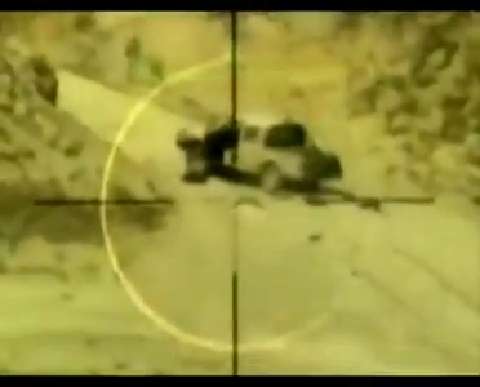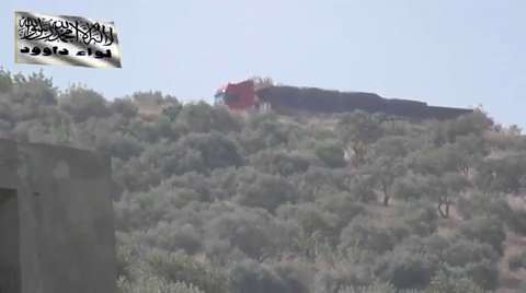 Syrian rebels film an IED attack on a Syrian Army ammunition truck. A massive explosion incinerates the truck.