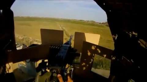 Humvee gunner returning fire takes some shrapnel to the neck.