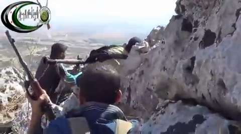 FSA rebels ambush SAA troops from a mountainside during recent clashes using RPGs and AK-47s. 07/22/2013.