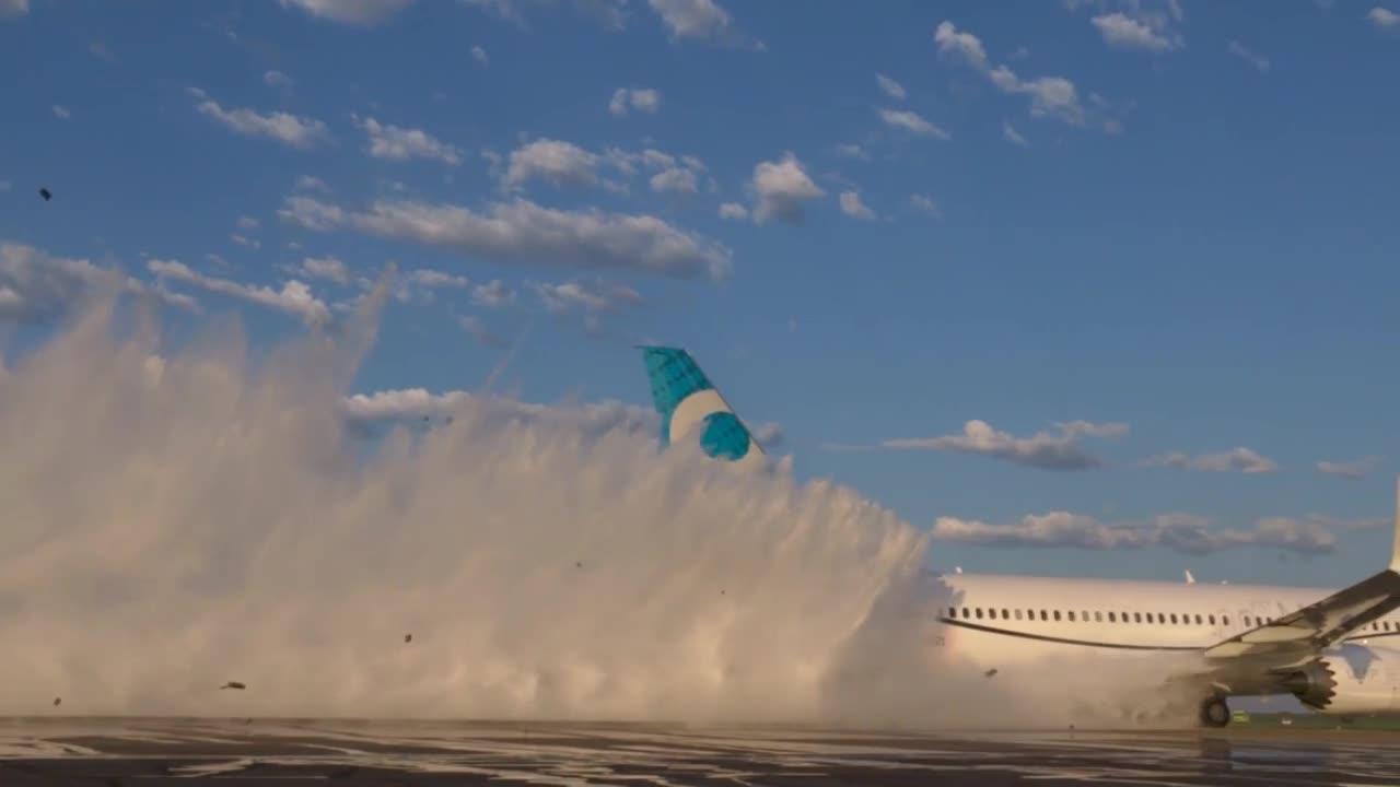 Boeing Test & Evaluation teams employ an Unmanned Aerial System during water spray testing for innovation and efficiency.
