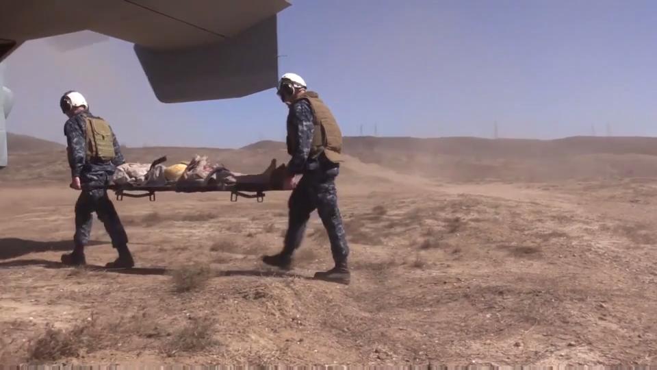 USMC Capt. Nathan Frame, Marine Medium Tiltrotor Squadron 364, and U.S. Navy Corpsman Hospitalman 1st Class Mark Skaggs, Marine Aircraft