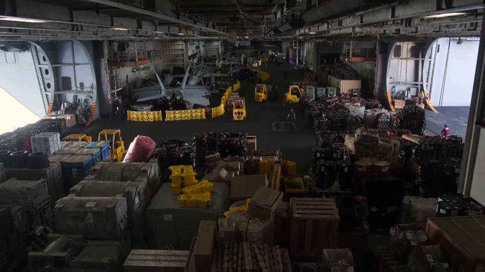 Sailors work in the hangar bay aboard the aircraft carrier USS Dwight D. Eisenhower (CVN 69). The ship and its