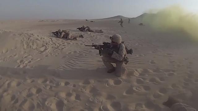 U.S. Marines with the 13th Marine Expeditionary Unit conduct a live-fire assault on a training objective using service rifles, 40mm