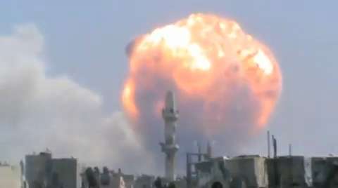An SAA parachute bomb drops in front of a civilian cameraman and explodes moments later in a Syrian residential area