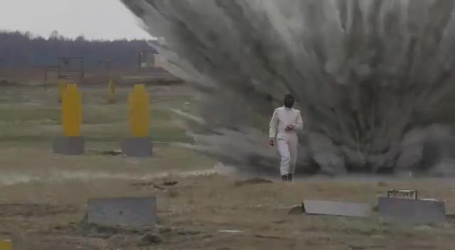 A Russian soldier earned accolades after she walked through a minefield while testing an explosive-proof suit as bombs blew up