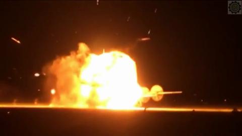 A Russian airstrike on a rebel ammunition factory causes a massive secondary explosion when the ammo ignites.