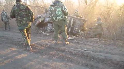 A Ukrainian army BMP-2 carrying soldiers nearly collides head-on with car, swerving off the road to miss it.