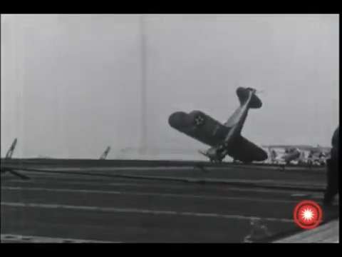 Vintage footage of a Grumman F3F fighter aircraft crash landing on an aircraft carrier in 1938. The Grumman F3F was