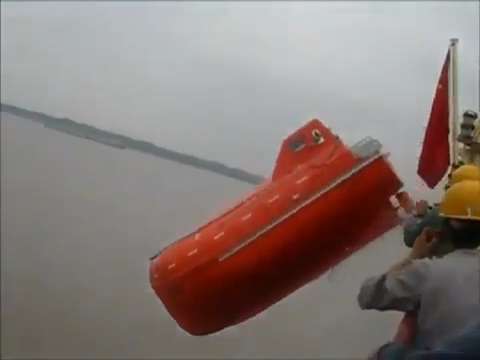 A lifeboat launch onboard a Chinese-flagged ship turns into amusement park ride, resulting in a massive front flip. The lifeboat