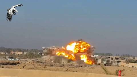A precision-guided bomb from a coalition aircraft destroys an ISIS position during the battle of Ramadi. Iraqi soldiers of the
