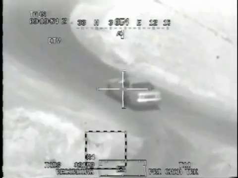 B-roll of aerial gun tape vehicle engagement. Scenes include Apache helicopter identifying and engaging vehicles with hellfire missiles and 30mm