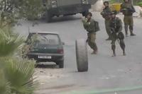 Palestinians go bowling with tires and one IDF soldier becomes the pin.